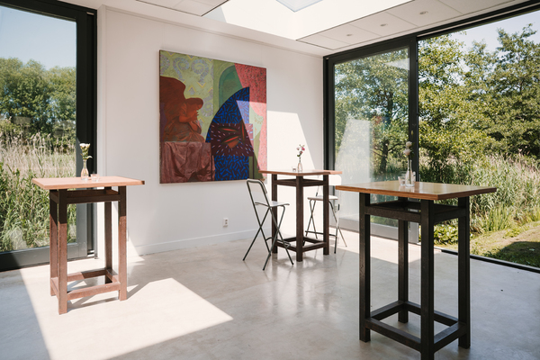 Alle negen ruimten die Art Centre Delft exploiteert, maken via grote raampartijen, openslaande deuren en zorgvuldig geselecteerde materialen verbinding met de natuur. De serre bijvoorbeeld, die in augustus van dit jaar in gebruik is genomen en die direct aan de kunstgalerie grenst. "Hier kunnen we een borrel voor honderd mensen organiseren, maar net zo goed congressen tot tweehonderd personen", geeft Tamar aan. Een grote veranda ademt de sfeer van het buitenleven en vier lichtstraten dragen eraan bij dat iedereen zich prettig zal voelen, terwijl een vaste bar van cortenstaal een natuurlijk effect toevoegt. Opdrachtgevers die hun gasten iets willen laten proeven van de historie van het landgoed, zouden de Thuiskamer moeten overwegen, ondergebracht in de boerderij die in zijn oorspronkelijke hoedanigheid uit het jaar 1800 stamt. De ouderwetse opkamer verdeelt de ruimte in twee niveaus en brengt maximaal 25 mensen rond de open haard, onder het klassieke plafond met zware houten balken. Bepaald geen standaardlocatie dus, Art Centre Delft. Dat blijkt ook uit de eigen catering op biologische basis en verrassende activiteiten (al dan niet in samenwerking met partners), zoals schilderworkshops, een cursus schapendrijven of boogschieten. Hier midden in de Randstad voel je je één met de natuur.