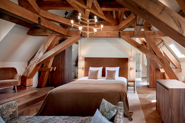 Terwijl we de deur openen van onze suite die zich in het kasteel bevindt, valt ons meteen de elegante en klassieke uitstraling op. Zo zien we een hoog plafond en monumentale ramen. Massief eiken- en notenhout vormen de basis van het meubilair, aangevuld met subtiele messing accenten in lampen en accessoires. De vloer combineert hout en natuursteen, afgewisseld met een handgeweven tapijt. Bij Van Oys ervaar je slapen op het hoogste niveau van comfort. Zo droom je weg op een handgestikt matras dat perfect aansluit bij je lichaam. De serene sfeer van de kamer wordt versterkt door gordijnen en bedspreien van hoogwaardig linnen en zijde, die samen een gevoel van rust en elegantie creëren. De badkamer is een oase van verfijning. Strakke, elegante lijnen worden gecombineerd met hoogwaardige materialen zoals natuursteen en donker hout. Een royale regendouche en een vrijstaand ligbad nodigen uit tot ontspanning, terwijl zachte handdoeken en luxe verzorgingsproducten het comfort compleet maken. Grote spiegels en subtiele verlichting creëren een gevoel van ruimte.